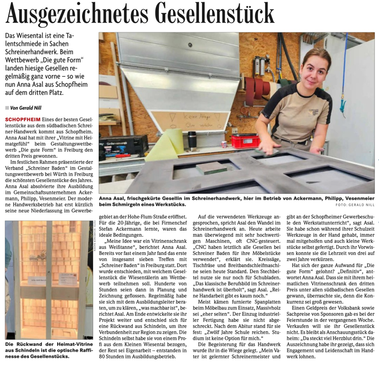 Zeitungsartikel der Badischen Zeitung zur ausgezeichneten Jung-Gesellin Anna Asal vom Ausbildungsbetrieb APV Schreinerei aus Schopfheim (https://www.apvschreinerei.de/)